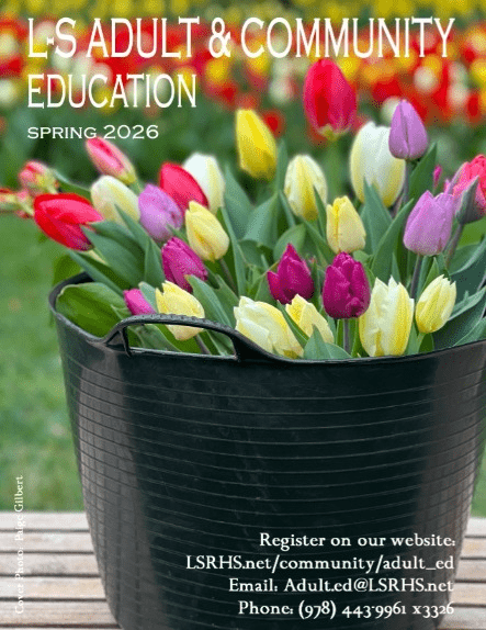 Welcome to Lincoln-Sudbury Adult & Community Education Lincoln-Sudbury Adult & Community Education uses a convenient, mobile-friendly, online tool to register and manage your enrollments/payments from any device, including your smartphone or tablet. Ready to begin registration? CREATE OR LOG INTO your profile here: LOGIN / CREATE PROFILEAfter you create your login/profile, BROWSE CLASSES and REGISTER by selecting: REGISTER HERE CLASS CREDITS APPLIED TO CURRENT SCHOOL YEAR ONLY.SEE BELOW FOR REFUND POLICY. CLICK PHOTO TO VIEW OUR BROCHURE. SPRING 2026 registration 2/1/26! Tuition must be paid online at the time of registration. There is no additional fee to make an online payment. You may pay using VISA, Mastercard, Discover, American Express, or online from your checking account. We do not charge an extra fee for out-of-town participants. Take an in-person or online class with a friend or family member who lives elsewhere! Thank you for supporting our non-profit program.REFUNDS: Withdrawal from a class must be requested at least 8 days in advance of the first class meeting, and either a refund minus a $10 processing fee or a credit toward another class will be issued. NO CREDIT OR REFUND PROVIDED FOR WITHDRAWALS WITHIN ONE WEEK OF THE START OF CLASS.Questions? Contact us at adult.ed@lsrhs.netThe mission of the Lincoln-Sudbury Adult & Community Education program is to provide a variety of quality courses that educate, enrich, enhance and inspire our community to meet their personal and professional goals. Our non-profit program promotes the Lincoln-Sudbury Regional High School and greater community to residents in Lincoln, Sudbury, and beyond. We develop, plan, and implement programs in a wide range of subject areas; academic courses, career skills, creative arts, home improvement, adult health and exercise programs, and community enrichment. We partner and collaborate with other non-profit community groups.We publish a course brochure twice annually. It is mailed to all households in Sudbury, Lincoln, Maynard, Stow, Weston and Wayland. Purchase a Gift Certificate Our gift certificates can be applied to any Lincoln-Sudbury Adult & Community Ed program or activity. Within 2 business days after purchasing, you will receive the gift certificate via email. You may then print it or email it to the recipient. Purchase Gift Certificate Make a Donation Please consider making a donation to our program. The mission of Lincoln-Sudbury Adult & Community Education is to provide a variety of quality courses that educate, enrich, enhance and inspire our community to meet their personal and professional goals. Our non-profit, self-supporting program promotes the greater community to residents in Lincoln, Sudbury, Wayland, Weston, Maynard and beyond. DONATE Teach with US! Do you have an idea for a course and would like to share your talents? Click on the button below and fill out our course proposal form. Course Proposal THANK YOU TO OUR SPONSORS Click here to visit Website Click here to visit Website Click here to visit Website Click here to visit Website Contact Us:Lincoln-Sudbury Adult & Community Education390 Lincoln Rd.Sudbury, MA 01776EMAIL: adult.ed@lsrhs.netPHONE: 978-443-9961 x3326 Contact Us